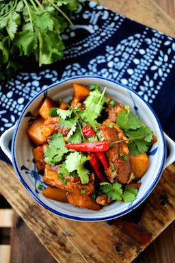 Sườn om khoai tây có màu cánh gián đẹp mắt. Sắc xanh mượt mà của rau mùi và đỏ tươi của ớt trên bề mặt khiến cho món ăn quen thuộc bỗng toát lên một sức hấp dẫn mới mẻ. Sườn mềm nhưng lại chắc, vừa đậm đà mà lại đượm chút cay nồng đủ để làm ấm mâm cơm gia đình ngày trở rét. Khoai tây chín mềm, thấm vị ngọt của thịt, nhấn nhá thêm chút cay mà lại thoảng hương tiêu thơm ấm.