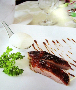 Một kiểu món ăn Trung Hoa nhưng không giống như vịt quay Bắc Kinh – khi ăn cần cuộn với bánh tráng. Món này chỉ đơn giản dùng kèm bánh bao hoặc cơm trắng.