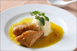 Một món ăn về hình thức trông có vẻ rất Tây nhưng nguyên liệu lại rất Việt. Đây là món tráng miệng lạ, kết hợp được giữa “vị nóng” và “vị lạnh” một cách nhuần nhị.