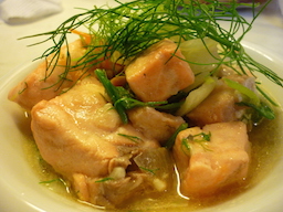 Cá hồi ngọt thịt, đậm đà mùi gia vị, và mùi rau thì là. Món này ăn nóng với cơm rất ngon.